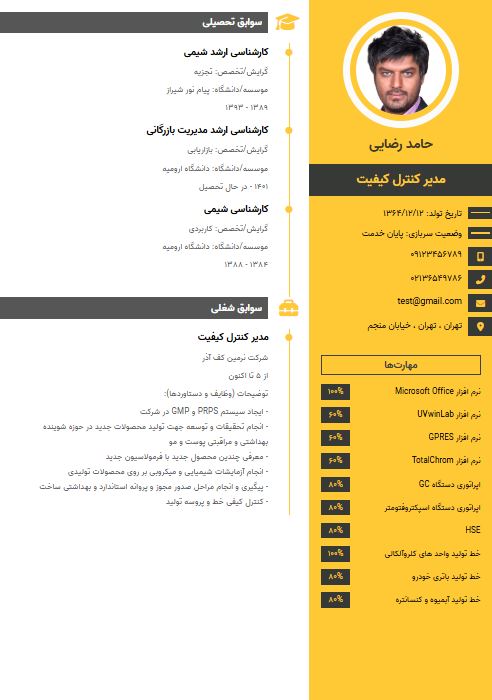 رزومه مدیر کنترل کیفیت سندی حرفهای است که مهارتها، تجربیات و دستاوردهای شما را در زمینه نظارت و بهبود کیفیت محصولات یا خدمات به نمایش میگذارد. هدف اصلی این رزومه، نشان دادن توانایی شما در طراحی و اجرای فرآیندهای کنترل کیفیت، کاهش نقصها و اطمینان از انطباق با استانداردهای صنعت است تا کارفرمایان را متقاعد کند که شما میتوانید کیفیت عملکرد سازمان را ارتقا دهید. این سند باید دقت، تحلیلگری و تعهد شما به کیفیت را به روشنی نشان دهد.